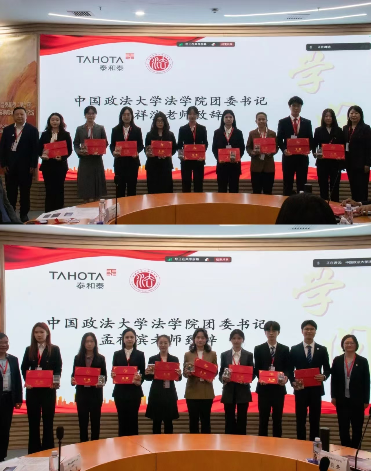 嘉宾代表和泰和泰律师事务所合伙人王淑焕律师对参会高校进行礼赠并合影留念。